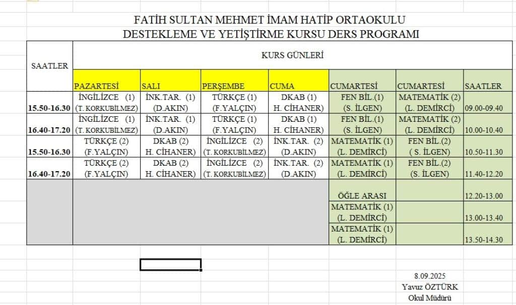 Fatih Sultan Mehmet İmam Hatip Ortaokulu Destekleme Ve Yetiştirme Kursu Haftalık Ders Çizelgesi